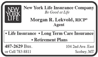 New York Life Insurance Company Be Good at Life Morgan R. Lekvold, RICP Agent • Life Insurance • Long Term Care Insurance • Retirement Plans 487-2629 Bus. 104 2nd Ave. East or Cell 783-8811 Scobey, MT New York Life Insurance Company Be Good at Life Morgan R. Lekvold, RICP Agent • Life Insurance • Long Term Care Insurance • Retirement Plans 487-2629 Bus. 104 2nd Ave. East or Cell 783-8811 Scobey, MT