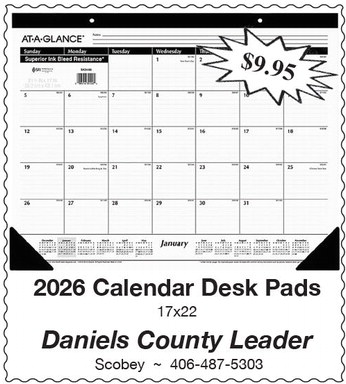 News Posted on January 14, 2026 Posted on January 14, 2026 $ 9.9- 5 2026 Calendar Desk Pads 17x22 Daniels County Leader Scobey ~ 406-487-5303 $ 9.9- 5 2026 Calendar Desk Pads 17x22 Daniels County Leader Scobey ~ 406-487-5303