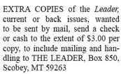 EXTRA COPIES of the Leader, current or back issues, wanted to be sent by mail, send a check or cash to the extent of $3.00 per copy, to include mailing and handling to THE LEADER, Box 850, Scobey, MT 59263 EXTRA COPIES of the Leader, current or back issues, wanted to be sent by mail, send a check or cash to the extent of $3.00 per copy, to include mailing and handling to THE LEADER, Box 850, Scobey, MT 59263