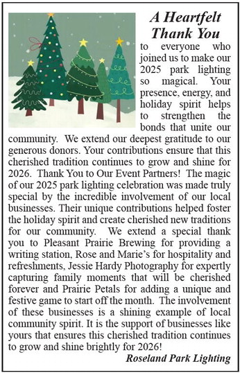 A Heartfelt Thank You to everyone who joined us to make our 2025 park lighting so magical. Your presence, energy, and holiday spirit helps to strengthen the bonds that unite our community. We extend our deepest gratitude to our generous donors. Your contributions ensure that this cherished tradition continues to grow and shine for 2026. Thank You to Our Event Partners! The magic of our 2025 park lighting celebration was made truly special by the incredible involvement of our local businesses. Their unique contributions helped foster the holiday spirit and create cherished new traditions for our community. We extend a special thank you to Pleasant Prairie Brewing for providing a writing station, Rose and Marie’s for hospitality and refreshments, Jessie Hardy Photography for expertly capturing family moments that will be cherished forever and Prairie Petals for adding a unique and festive game to start off the month. The involvement of these businesses is a shining example of local community spirit. It is the support of businesses like yours that ensures this cherished tradition continues to grow and shine brightly for 2026! Roseland Park Lighting A Heartfelt Thank You to everyone who joined us to make our 2025 park lighting so magical. Your presence, energy, and holiday spirit helps to strengthen the bonds that unite our community. We extend our deepest gratitude to our generous donors. Your contributions ensure that this cherished tradition continues to grow and shine for 2026. Thank You to Our Event Partners! The magic of our 2025 park lighting celebration was made truly special by the incredible involvement of our local businesses. Their unique contributions helped foster the holiday spirit and create cherished new traditions for our community. We extend a special thank you to Pleasant Prairie Brewing for providing a writing station, Rose and Marie’s for hospitality and refreshments, Jessie Hardy Photography for expertly capturing family moments that will be cherished forever and Prairie Petals for adding a unique and festive game to start off the month. The involvement of these businesses is a shining example of local community spirit. It is the support of businesses like yours that ensures this cherished tradition continues to grow and shine brightly for 2026! Roseland Park Lighting