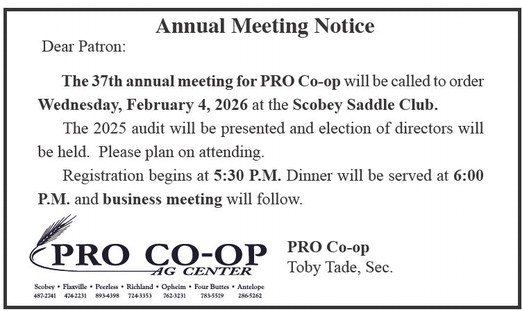 Annual Meeting Notice Dear Patron: The 37th annual meeting for PRO Co-op will be called to order Wednesday, February 4, 2026 at the Scobey Saddle Club. The 2025 audit will be presented and election of directors will be held. Please plan on attending. Registration begins at 5:30 P.M. Dinner will be served at 6:00 P.M. and business meeting will follow. PRO Co-op Toby Tade, Sec. Annual Meeting Notice Dear Patron: The 37th annual meeting for PRO Co-op will be called to order Wednesday, February 4, 2026 at the Scobey Saddle Club. The 2025 audit will be presented and election of directors will be held. Please plan on attending. Registration begins at 5:30 P.M. Dinner will be served at 6:00 P.M. and business meeting will follow. PRO Co-op Toby Tade, Sec.