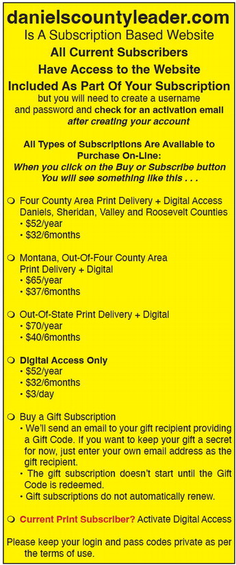 danielscountyleader.com Is A Subscription Based Website All Current Subscribers Have Access to the Website Included As Part Of Your Subscription but you will need to create a username and password and check for an activation email after creating your account All Types of Subscriptions Are Available to Purchase On-Line: When you click on the Buy or Subscribe button You will see something like this . . . Four County Area Print Delivery + Digital Access Daniels, Sheridan, Valley and Roosevelt Counties • $52/year • $32/6months Montana, Out-Of-Four County Area Print Delivery + Digital • $65/year • $37/6months Out-Of-State Print Delivery + Digital • $70/year • $40/6months Digital Access Only • $52/year • $32/6months • $3/day Buy a Gift Subscription • We’ll send an email to your gift recipient providing a Gift Code. If you want to keep your gift a secret for now, just enter your own email address as the gift recipient. • The gift subscription doesn’t start until the Gift Code is redeemed. • Gift subscriptions do not automatically renew. Current Print Subscriber? Activate Digital Access Please keep your login and pass codes private as per the terms of use. danielscountyleader.com Is A Subscription Based Website All Current Subscribers Have Access to the Website Included As Part Of Your Subscription but you will need to create a username and password and check for an activation email after creating your account All Types of Subscriptions Are Available to Purchase On-Line: When you click on the Buy or Subscribe button You will see something like this . . . Four County Area Print Delivery + Digital Access Daniels, Sheridan, Valley and Roosevelt Counties • $52/year • $32/6months Montana, Out-Of-Four County Area Print Delivery + Digital • $65/year • $37/6months Out-Of-State Print Delivery + Digital • $70/year • $40/6months Digital Access Only • $52/year • $32/6months • $3/day Buy a Gift Subscription • We’ll send an email to your gift recipient providing a Gift Code. If you want to keep your gift a secret for now, just enter your own email address as the gift recipient. • The gift subscription doesn’t start until the Gift Code is redeemed. • Gift subscriptions do not automatically renew. Current Print Subscriber? Activate Digital Access Please keep your login and pass codes private as per the terms of use.