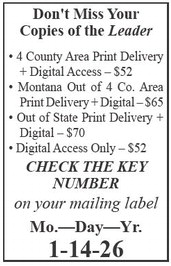 Don't Miss Your Copies of the Leader • 4 County Area Print Delivery + Digital Access – $52 • Montana Out of 4 Co. Area Print Delivery + Digital – $65 • Out of State Print Delivery + Digital – $70 • Digital Access Only – $52 CHECK THE KEY NUMBER on your mailing label Mo.—Day—Yr. 1-14-26 Don't Miss Your Copies of the Leader • 4 County Area Print Delivery + Digital Access – $52 • Montana Out of 4 Co. Area Print Delivery + Digital – $65 • Out of State Print Delivery + Digital – $70 • Digital Access Only – $52 CHECK THE KEY NUMBER on your mailing label Mo.—Day—Yr. 1-14-26