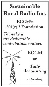 Sustainable Rural Radio Inc. KCGM’s 501(c) 3 Foundation To make a tax deductible contribution contact: KCGM or Tade Accounting in Scobey Sustainable Rural Radio Inc. KCGM’s 501(c) 3 Foundation To make a tax deductible contribution contact: KCGM or Tade Accounting in Scobey