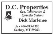 D.C. Properties Gen. Construction & Sprinkler Systems Dick Marlenee ph - 406-783-7390 Scobey, MT 59263 D.C. Properties Gen. Construction & Sprinkler Systems Dick Marlenee ph - 406-783-7390 Scobey, MT 59263
