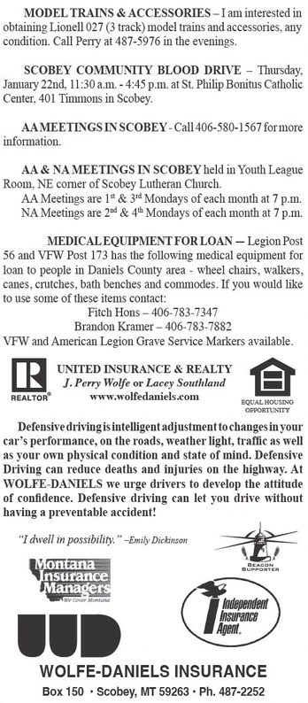 MODELTRAINS & ACCESSORIES – I am interested in obtaining Lionell 027 (3 track) model trains and accessories, any condition. Call Perry at 487-5976 in the evenings. SCOBEY COMMUNITY BLOOD DRIVE – Thursday, January 22nd, 11:30 a.m. - 4:45 p.m. at St. Philip Bonitus Catholic Center, 401 Timmons in Scobey. AAMEETINGSINSCOBEY- Call 406-580-1567 for more information. AA & NA MEETINGS IN SCOBEY held in Youth League Room, NE corner of Scobey Lutheran Church. AA Meetings are 1st & 3rd Mondays of each month at 7 p.m. NA Meetings are 2nd & 4th Mondays of each month at 7 p.m. MEDICALEQUIPMENTFORLOAN— Legion Post 56 and VFW Post 173 has the following medical equipment for loan to people in Daniels County area - wheel chairs, walkers, canes, crutches, bath benches and commodes. If you would like to use some of these items contact: Fitch Hons – 406-783-7347 Brandon Kramer – 406-783-7882 VFW and American Legion Grave Service Markers available. UNITED INSURANCE & REALTY J. Perry Wolfe or Lacey Southland www.wolfedaniels.com EQUAL HOUSING OPPORTUNITY Defensivedrivingisintelligentadjustmenttochangesinyour car’s performance, on the roads, weather light, traffic as well as your own physical condition and state of mind. Defensive Driving can reduce deaths and injuries on the highway. At WOLFE-DANIELS we urge drivers to develop the attitude of confidence. Defensive driving can let you drive without having a preventable accident! “I dwell in possibility.” –Emily Dickinson WOLFE-DANIELS INSURANCE Box 150 • Scobey, MT 59263 • Ph. 487-2252 MODELTRAINS & ACCESSORIES – I am interested in obtaining Lionell 027 (3 track) model trains and accessories, any condition. Call Perry at 487-5976 in the evenings. SCOBEY COMMUNITY BLOOD DRIVE – Thursday, January 22nd, 11:30 a.m. - 4:45 p.m. at St. Philip Bonitus Catholic Center, 401 Timmons in Scobey. AAMEETINGSINSCOBEY- Call 406-580-1567 for more information. AA & NA MEETINGS IN SCOBEY held in Youth League Room, NE corner of Scobey Lutheran Church. AA Meetings are 1st & 3rd Mondays of each month at 7 p.m. NA Meetings are 2nd & 4th Mondays of each month at 7 p.m. MEDICALEQUIPMENTFORLOAN— Legion Post 56 and VFW Post 173 has the following medical equipment for loan to people in Daniels County area - wheel chairs, walkers, canes, crutches, bath benches and commodes. If you would like to use some of these items contact: Fitch Hons – 406-783-7347 Brandon Kramer – 406-783-7882 VFW and American Legion Grave Service Markers available. UNITED INSURANCE & REALTY J. Perry Wolfe or Lacey Southland www.wolfedaniels.com EQUAL HOUSING OPPORTUNITY Defensivedrivingisintelligentadjustmenttochangesinyour car’s performance, on the roads, weather light, traffic as well as your own physical condition and state of mind. Defensive Driving can reduce deaths and injuries on the highway. At WOLFE-DANIELS we urge drivers to develop the attitude of confidence. Defensive driving can let you drive without having a preventable accident! “I dwell in possibility.” –Emily Dickinson WOLFE-DANIELS INSURANCE Box 150 • Scobey, MT 59263 • Ph. 487-2252