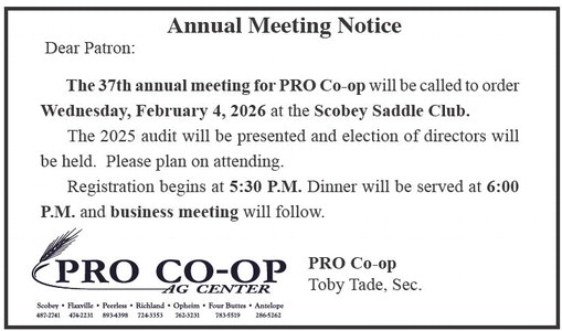 Annual Meeting Notice Dear Patron: The 37th annual meeting for PRO Co-op will be called to order Wednesday, February 4, 2026 at the Scobey Saddle Club. The 2025 audit will be presented and election of directors will be held. Please plan on attending. Registration begins at 5:30 P.M. Dinner will be served at 6:00 P.M. and business meeting will follow. PRO Co-op Toby Tade, Sec. Annual Meeting Notice Dear Patron: The 37th annual meeting for PRO Co-op will be called to order Wednesday, February 4, 2026 at the Scobey Saddle Club. The 2025 audit will be presented and election of directors will be held. Please plan on attending. Registration begins at 5:30 P.M. Dinner will be served at 6:00 P.M. and business meeting will follow. PRO Co-op Toby Tade, Sec.