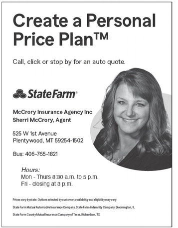 Create a Personal Price Plan™ Call, click or stop by for an auto quote. McCrory Insurance Agency Inc Sherri McCrory, Agent 525 W 1st Avenue Plentywood, MT 59254-1502 Bus: 406-765-1821 Hours: Mon - Thurs 8:30 a.m. to 5 p.m. Fri - closing at 3 p.m. Prices vary by state. Options selected by customer; availability and eligibility may vary. State Farm Mutual Automobile Insurance Company, State Farm Indemnity Company, Bloomington, IL State Farm County Mutual Insurance Company of Texas, Richardson, TX