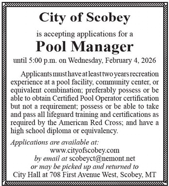 City of Scobey is accepting applications for a Pool Manager until 5:00 p.m. on Wednesday, February 4, 2026 Applicantsmusthaveatleasttwoyearsrecreation experience at a pool facility, community center, or equivalent combination; preferably possess or be able to obtain Certified Pool Operator certification but not a requirement; possess or be able to take and pass all lifeguard training and certifications as required by the American Red Cross; and have a high school diploma or equivalency. Applications are available at: www.cityofscobey.com by email at scobeyct@nemont.net or may be picked up and returned to City Hall at 708 First Avenue West, Scobey, MT City of Scobey is accepting applications for a Pool Manager until 5:00 p.m. on Wednesday, February 4, 2026 Applicantsmusthaveatleasttwoyearsrecreation experience at a pool facility, community center, or equivalent combination; preferably possess or be able to obtain Certified Pool Operator certification but not a requirement; possess or be able to take and pass all lifeguard training and certifications as required by the American Red Cross; and have a high school diploma or equivalency. Applications are available at: www.cityofscobey.com by email at scobeyct@nemont.net or may be picked up and returned to City Hall at 708 First Avenue West, Scobey, MT