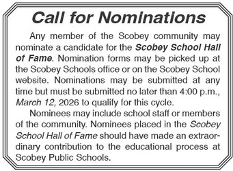 Call for Nominations Any member of the Scobey community may nominate a candidate for the Scobey School Hall of Fame. Nomination forms may be picked up at the Scobey Schools office or on the Scobey School website. Nominations may be submitted at any time but must be submitted no later than 4:00 p.m., March 12, 2026 to qualify for this cycle. Nominees may include school staff or members of the community. Nominees placed in the Scobey School Hall of Fame should have made an extraordinary contribution to the educational process at Scobey Public Schools. Call for Nominations Any member of the Scobey community may nominate a candidate for the Scobey School Hall of Fame. Nomination forms may be picked up at the Scobey Schools office or on the Scobey School website. Nominations may be submitted at any time but must be submitted no later than 4:00 p.m., March 12, 2026 to qualify for this cycle. Nominees may include school staff or members of the community. Nominees placed in the Scobey School Hall of Fame should have made an extraordinary contribution to the educational process at Scobey Public Schools.