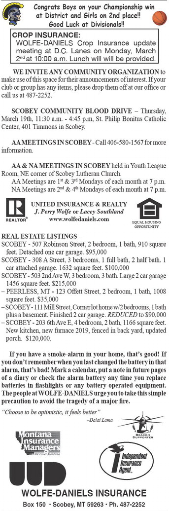 Congrats Boys on your Championship win at District and Girls on 2nd place!! Good Luck at Divisionals!! CROP INSURANCE: WOLFE-DANIELS Crop Insurance update meeting at D.C. Lanes on Monday, March 2nd at 10:00 a.m. Lunch will will be provided. WE INVITEANY COMMUNITY ORGANIZATION to make use of this space for their announcements of interest. If your club or group has any items, please drop them off at our office or call us at 487-2252. SCOBEY COMMUNITY BLOOD DRIVE – Thursday, March 19th, 11:30 a.m. - 4:45 p.m, St. Philip Bonitus Catholic Center, 401 Timmons in Scobey. AAMEETINGSINSCOBEY- Call 406-580-1567 for more information. AA & NA MEETINGS IN SCOBEY held in Youth League Room, NE corner of Scobey Lutheran Church. AA Meetings are 1st & 3rd Mondays of each month at 7 p.m. NA Meetings are 2nd & 4th Mondays of each month at 7 p.m. UNITED INSURANCE & REALTY J. Perry Wolfe or Lacey Southland www.wolfedaniels.com EQUAL HOUSING OPPORTUNITY REAL ESTATE LISTINGS – SCOBEY - 507 Robinson Street, 2 bedroom, 1 bath, 910 square feet. Detached one car garage. $95,000 SCOBEY - 308 A Street, 3 bedrooms, 1 full bath, 2 half bath. 1 car attached garage. 1632 square feet. $100,000 SCOBEY - 503 2ndAve W, 3 bedroom, 3 bath. Large 2 car garage 1456 square feet. $215,000 – PEERLESS, MT - 123 Offett Street, 2 bedroom, 1 bath, 1008 square feet. $35,000 –SCOBEY-111MillStreet,Cornerlothomew/2bedrooms,1bath plus a basement. Finished 2 car garage. REDUCED to $90,000 – SCOBEY - 203 6th Ave E, 4 bedroom, 2 bath, 1166 square feet. New kitchen, new furnace 2019, fenced in back yard, updated porch. $120,000. If you have a smoke-alarm in your home, that’s good! If you don’t remember when you last changed the battery in that alarm, that’s bad! Mark a calendar, put a note in future pages of a diary or check the alarm battery any time you replace batteries in flashlights or any battery-operated equipment. The people at WOLFE-DANIELS urge you to take this simple precaution to avoid the tragedy of a major fire. “Choose to be optimistic, it feels better” –Dalai Lama WOLFE-DANIELS INSURANCE Box 150 • Scobey, MT 59263 • Ph. 487-2252 Congrats Boys on your Championship win at District and Girls on 2nd place!! Good Luck at Divisionals!! CROP INSURANCE: WOLFE-DANIELS Crop Insurance update meeting at D.C. Lanes on Monday, March 2nd at 10:00 a.m. Lunch will will be provided. WE INVITEANY COMMUNITY ORGANIZATION to make use of this space for their announcements of interest. If your club or group has any items, please drop them off at our office or call us at 487-2252. SCOBEY COMMUNITY BLOOD DRIVE – Thursday, March 19th, 11:30 a.m. - 4:45 p.m, St. Philip Bonitus Catholic Center, 401 Timmons in Scobey. AAMEETINGSINSCOBEY- Call 406-580-1567 for more information. AA & NA MEETINGS IN SCOBEY held in Youth League Room, NE corner of Scobey Lutheran Church. AA Meetings are 1st & 3rd Mondays of each month at 7 p.m. NA Meetings are 2nd & 4th Mondays of each month at 7 p.m. UNITED INSURANCE & REALTY J. Perry Wolfe or Lacey Southland www.wolfedaniels.com EQUAL HOUSING OPPORTUNITY REAL ESTATE LISTINGS – SCOBEY - 507 Robinson Street, 2 bedroom, 1 bath, 910 square feet. Detached one car garage. $95,000 SCOBEY - 308 A Street, 3 bedrooms, 1 full bath, 2 half bath. 1 car attached garage. 1632 square feet. $100,000 SCOBEY - 503 2ndAve W, 3 bedroom, 3 bath. Large 2 car garage 1456 square feet. $215,000 – PEERLESS, MT - 123 Offett Street, 2 bedroom, 1 bath, 1008 square feet. $35,000 –SCOBEY-111MillStreet,Cornerlothomew/2bedrooms,1bath plus a basement. Finished 2 car garage. REDUCED to $90,000 – SCOBEY - 203 6th Ave E, 4 bedroom, 2 bath, 1166 square feet. New kitchen, new furnace 2019, fenced in back yard, updated porch. $120,000. If you have a smoke-alarm in your home, that’s good! If you don’t remember when you last changed the battery in that alarm, that’s bad! Mark a calendar, put a note in future pages of a diary or check the alarm battery any time you replace batteries in flashlights or any battery-operated equipment. The people at WOLFE-DANIELS urge you to take this simple precaution to avoid the tragedy of a major fire. “Choose to be optimistic, it feels better” –Dalai Lama WOLFE-DANIELS INSURANCE Box 150 • Scobey, MT 59263 • Ph. 487-2252