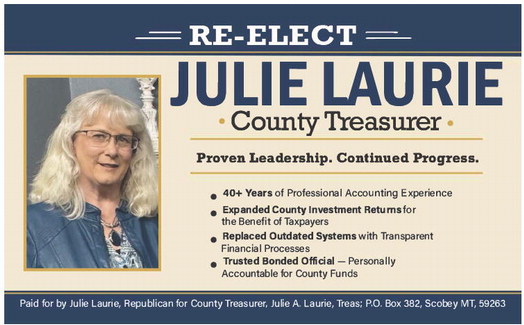 ---===RE-ELECT===--- JULIE LAURIE • County Treasurer • Proven Leadership. Continued Progress. • 40+ Years of Professional Accounting Experience • Expanded County Investment Returns for the Benefit of Taxpayers • Replaced Outdated Systems with Transparent Financial Processes • Trusted Bonded Official - Personally Accountable for County Funds Paid for by Julie Laune, Republican for County Treasurer, Julie A. Laune, Treas; P.O. Box 382, Scobey MT, 59263 ---===RE-ELECT===--- JULIE LAURIE • County Treasurer • Proven Leadership. Continued Progress. • 40+ Years of Professional Accounting Experience • Expanded County Investment Returns for the Benefit of Taxpayers • Replaced Outdated Systems with Transparent Financial Processes • Trusted Bonded Official - Personally Accountable for County Funds Paid for by Julie Laune, Republican for County Treasurer, Julie A. Laune, Treas; P.O. Box 382, Scobey MT, 59263