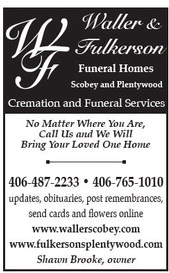 Waller & Fulkerson Funeral Homes Scobey and Plentywood Cremation and Funeral Services No Matter Where You Are, Call Us and We Will Bring Your Loved One Home 406-487-2233 • 406-765-1010 updates, obituaries, post remembrances, send cards and flowers online www.wallerscobey.com www.fulkersonsplentywood.com Shawn Brooke, owner Waller & Fulkerson Funeral Homes Scobey and Plentywood Cremation and Funeral Services No Matter Where You Are, Call Us and We Will Bring Your Loved One Home 406-487-2233 • 406-765-1010 updates, obituaries, post remembrances, send cards and flowers online www.wallerscobey.com www.fulkersonsplentywood.com Shawn Brooke, owner