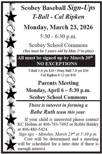 Scobey Baseball Sign-Ups T-Ball - Cal Ripken Monday, March 23, 2026 5:30 - 6:30 p.m. Scobey School Commons (You must be 5 years old by May 1st to play) T-Ball 5-6 yrs $30 • Pony Ball 7-8 yrs $30 Cal Ripken 9-12 yrs $50 All must be signed up by March 30th NO EXCEPTIONS Parents Meeting Monday, April 6 – 5:30 p.m. Scobey School Commons There is interest in forming a Babe Ruth team this year. If your child is interested please contact KC Holum at 406-783-7692 or Robbi Baldry at 406-480-5424. Sign ups – Monday, March 23rd at 5:30 p.m. Cost will be determined and a meeting will be scheduled for a later date if there is enough interest. Scobey Baseball Sign-Ups T-Ball - Cal Ripken Monday, March 23, 2026 5:30 - 6:30 p.m. Scobey School Commons (You must be 5 years old by May 1st to play) T-Ball 5-6 yrs $30 • Pony Ball 7-8 yrs $30 Cal Ripken 9-12 yrs $50 All must be signed up by March 30th NO EXCEPTIONS Parents Meeting Monday, April 6 – 5:30 p.m. Scobey School Commons There is interest in forming a Babe Ruth team this year. If your child is interested please contact KC Holum at 406-783-7692 or Robbi Baldry at 406-480-5424. Sign ups – Monday, March 23rd at 5:30 p.m. Cost will be determined and a meeting will be scheduled for a later date if there is enough interest.