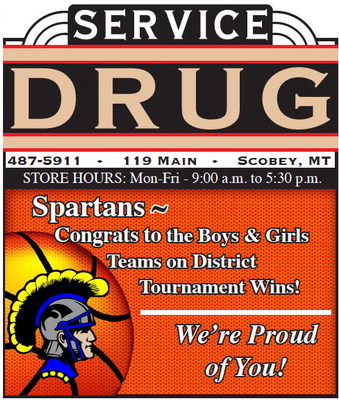 487-5911 • 119 Main • Scobey, MT STORE HOURS: Mon-Fri - 9:00 a.m. to 5:30 p.m. Spartans ~ Congrats to the Boys & Girls Teams on District Tournament Wins! We’re Proud of You! 487-5911 • 119 Main • Scobey, MT STORE HOURS: Mon-Fri - 9:00 a.m. to 5:30 p.m. Spartans ~ Congrats to the Boys & Girls Teams on District Tournament Wins! We’re Proud of You!