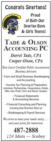 Congrats Spartans! Proud of Both Our Spartan Boys & Girls Teams! Tade & OlsOn accOunTing Pc Darrel Tade, CPA Cooper Olson, CPA Your Local Certified Public Accountants Business Advisors • Farm and Small Business Bookkeeping and Accounting • Income Tax Planning & Preparation Individual, Partnerships, Corporations, Estate, Gifts, Non-Profit, Farm and Ranch Taxation • Financial Statements & Accounting Services • Financial Consulting and Planning Including New Business Start-up • Bookkeeping & Payroll Services We strive to meet your needs today . . . and your plans for tomorrow. 487-2888 124 Main — Scobey Congrats Spartans! Proud of Both Our Spartan Boys & Girls Teams! Tade & OlsOn accOunTing Pc Darrel Tade, CPA Cooper Olson, CPA Your Local Certified Public Accountants Business Advisors • Farm and Small Business Bookkeeping and Accounting • Income Tax Planning & Preparation Individual, Partnerships, Corporations, Estate, Gifts, Non-Profit, Farm and Ranch Taxation • Financial Statements & Accounting Services • Financial Consulting and Planning Including New Business Start-up • Bookkeeping & Payroll Services We strive to meet your needs today . . . and your plans for tomorrow. 487-2888 124 Main — Scobey