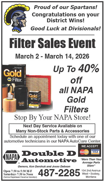 Proud of our Spartans! Congratulations on your District Wins! Good Luck at Divisionals! Filter Sales Event March 2 - March 14, 2026 Up To 40% off all NAPA Gold Filters Stop By Your NAPA Store! Next Day Service Available on Many Non-Stock Parts & Accessories Schedule an appointment today with one of our automotive technicians in our NAPA AutoCare Center. Double D Automotive Owners, Ken Darchuk and Jesse Dobson “More Than Your Average Parts Store” 104 2nd Avenue West • Scobey, Montana Open 7:30 to 5:30 M-F Saturdays 7:30 to Noon (Service Department Closed on Saturdays) 487-2285 Proud of our Spartans! Congratulations on your District Wins! Good Luck at Divisionals! Filter Sales Event March 2 - March 14, 2026 Up To 40% off all NAPA Gold Filters Stop By Your NAPA Store! Next Day Service Available on Many Non-Stock Parts & Accessories Schedule an appointment today with one of our automotive technicians in our NAPA AutoCare Center. Double D Automotive Owners, Ken Darchuk and Jesse Dobson “More Than Your Average Parts Store” 104 2nd Avenue West • Scobey, Montana Open 7:30 to 5:30 M-F Saturdays 7:30 to Noon (Service Department Closed on Saturdays) 487-2285