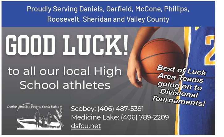 Proudly Serving Daniels, Garfield, McCone, Phillips, Roosevelt, Sheridan and Valley County Good Luck! to all our local High School athletes Best of Luck Area Teams going on to Divisional Tournaments! Scobey: (406) 487-5391 Medicine Lake: (406) 789-2209 dsfcu.net Daniels County Leader Daniels County Leader Printing, Publishing, Office Supplies • 214 Main • Scobey Proudly Serving Daniels, Garfield, McCone, Phillips, Roosevelt, Sheridan and Valley County Good Luck! to all our local High School athletes Best of Luck Area Teams going on to Divisional Tournaments! Scobey: (406) 487-5391 Medicine Lake: (406) 789-2209 dsfcu.net Daniels County Leader Daniels County Leader Printing, Publishing, Office Supplies • 214 Main • Scobey