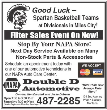 Good Luck – Spartan Basketball Teams at Divisionals in Miles City! Filter Sales Event On Now! Stop By Your NAPA Store! Next Day Service Available on Many Non-Stock Parts & Accessories Schedule an appointment today with one of our automotive technicians in our NAPA Auto Care Center. Double D Automotive Owners, Ken Darchuk and Jesse Dobson “More Than Your Average Parts Store” 104 2nd Avenue West • Scobey, Montana Open 7:30 to 5:30 M-F Saturdays 7:30 to Noon (Service Department Closed on Saturdays) 487-2285 Good Luck – Spartan Basketball Teams at Divisionals in Miles City! Filter Sales Event On Now! Stop By Your NAPA Store! Next Day Service Available on Many Non-Stock Parts & Accessories Schedule an appointment today with one of our automotive technicians in our NAPA Auto Care Center. Double D Automotive Owners, Ken Darchuk and Jesse Dobson “More Than Your Average Parts Store” 104 2nd Avenue West • Scobey, Montana Open 7:30 to 5:30 M-F Saturdays 7:30 to Noon (Service Department Closed on Saturdays) 487-2285