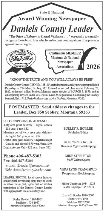 State & National Award Winning Newspaper Daniels County Leader 'The Price of Liberty is Eternal Vigilance . . . ' especially to sensibly recognize those brush fires which can become conflagrations of oppression against human rights. Continuous MEMBER Montana & National Newspaper Associations 2026 'KNOW THE TRUTH AND YOU WILLALWAYS BE FREE' DanielsCountyLeader(ISSNNo.148140),anindependentweeklynewspaperpublished Thursdays at 214 Main, Scobey, MT. Entered as second class matter February 23, 1922, at the post office, Scobey, Montana under the Act of MARCH 3, 1879, and as subsequently revised under U.S. Postal Laws & Regulations. Continuing the Scobey Sentinel, Est. 1912. Periodical postage paid at Scobey, Montana 59263. POSTMASTER: Send address changes to the Leader, Box 850 Scobey, Montana 59263 SUBSCRIPTIONS IN ADVANCE: 4-cty area print delivery + digital access $52 year, 6 mo. $32 Montana out of 4-cty area print delivery +- digital $65 year, 6 mo. $37 Out Of State print delivery + digital (except Canada and abroad) $70 year, 6 mo. $40 Digital Access Only $52 year, 6 mo. $32 BURLEY R. BOWLER Publisher/Editor ROZLYNN BOWLER Business Mgr./Bookkeeping MIKE STEBLETON Staff Writer/Sports VERA LYNN TRANGSRUD Receptionist/Bookkeeping Phone 406-487-5303 Fax: 406-487-5304 e mail: 2leader@nemont.net Web: danielscountyleader.com LEADER PHOTOS, local source features and original advertising copy may be used; in whole or in part, upon oral or written permission of the Daniels County Leader with appropriate use of courtesy line. Milton Gunderson 1934 - 2025 Leader Employee 1957-2018 Larry C. Bowler 1916-2000 Editor 1945-1996 Publisher 1967-2000 Montana Newspaper Hall of Fame- 2005 Burley Bowler 1890-1967 Publisher 1924-1967 Montana Newspaper Hall of Fame State & National Award Winning Newspaper Daniels County Leader 'The Price of Liberty is Eternal Vigilance . . . ' especially to sensibly recognize those brush fires which can become conflagrations of oppression against human rights. Continuous MEMBER Montana & National Newspaper Associations 2026 'KNOW THE TRUTH AND YOU WILLALWAYS BE FREE' DanielsCountyLeader(ISSNNo.148140),anindependentweeklynewspaperpublished Thursdays at 214 Main, Scobey, MT. Entered as second class matter February 23, 1922, at the post office, Scobey, Montana under the Act of MARCH 3, 1879, and as subsequently revised under U.S. Postal Laws & Regulations. Continuing the Scobey Sentinel, Est. 1912. Periodical postage paid at Scobey, Montana 59263. POSTMASTER: Send address changes to the Leader, Box 850 Scobey, Montana 59263 SUBSCRIPTIONS IN ADVANCE: 4-cty area print delivery + digital access $52 year, 6 mo. $32 Montana out of 4-cty area print delivery +- digital $65 year, 6 mo. $37 Out Of State print delivery + digital (except Canada and abroad) $70 year, 6 mo. $40 Digital Access Only $52 year, 6 mo. $32 BURLEY R. BOWLER Publisher/Editor ROZLYNN BOWLER Business Mgr./Bookkeeping MIKE STEBLETON Staff Writer/Sports VERA LYNN TRANGSRUD Receptionist/Bookkeeping Phone 406-487-5303 Fax: 406-487-5304 e mail: 2leader@nemont.net Web: danielscountyleader.com LEADER PHOTOS, local source features and original advertising copy may be used; in whole or in part, upon oral or written permission of the Daniels County Leader with appropriate use of courtesy line. Milton Gunderson 1934 - 2025 Leader Employee 1957-2018 Larry C. Bowler 1916-2000 Editor 1945-1996 Publisher 1967-2000 Montana Newspaper Hall of Fame- 2005 Burley Bowler 1890-1967 Publisher 1924-1967 Montana Newspaper Hall of Fame