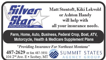 Matt Stentoft, Kiki Lekvold or Ashton Handy will help with all your insurance needs. Farm, Home, Auto, Business, Federal Crop, Boat, ATV, Motorcycle, Health & Medicare Supplement Plans 'Providing Insurance For Northeast Montana' 487-2629 or fax 487-5931 104 2nd Ave. E • Scobey, MT Matt Stentoft, Kiki Lekvold or Ashton Handy will help with all your insurance needs. Farm, Home, Auto, Business, Federal Crop, Boat, ATV, Motorcycle, Health & Medicare Supplement Plans 'Providing Insurance For Northeast Montana' 487-2629 or fax 487-5931 104 2nd Ave. E • Scobey, MT