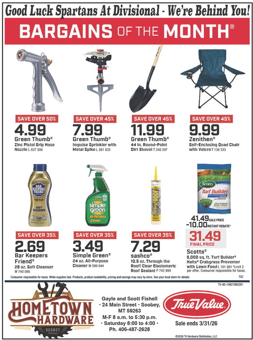 Sports Posted on March 4, 2026 Posted on March 4, 2026 Good Luck Spartans At Divisional - We’re Behind You! - Good Luck Spartans At Divisional - We’re Behind You! SAVE OVER 50% SAVE OVER 45% SAVE OVER 45% SAVE OVER 45% 4.99 7.99 11.99 9.99 Green Thumb Green Thumb Green Thumb Zenithen Zinc Pistol Grip Hose Nozzle L 637 506 Impulse Sprinkler with Metal Spike L 581 833 44 in. Round-Point Dirt Shovel T 248 297 Self-Enclosing Quad Chair with Velcro T 138 333 41.49SALE PRICE -10.00INSTANT REBATE* SAVE OVER 35% SAVE OVER 35% SAVE OVER 35% 31.49 2.69 3.49 7.29 Scotts Bar Keepers Friend Simple Green sashco 24 oz. All-Purpose Cleaner 5,000 sq. ft. Turf Builder Halts Crabgrass Preventer with Lawn Food 26 oz. Soft Cleanser W 599 944 10.5 oz. Through the Roof! Clear Elastomeric Roof Sealant W 740 086 P 742 999 per offer. Consumer responsible for taxes. L 161 991 *Limit 2 Consumer responsible for taxes. While supplies last. Products, product availability, pricing and savings may vary by store. See your local store for details. TXZ TV-AD-10821992291 Gayle and Scott Fishell • 24 Main Street • Scobey, MT 59263 M-F 8 a.m. to 5:30 p.m. • Saturday 8:00 to 4:00 • Ph. 406-487-2628 Sale ends 3/31/26 ©2026 TV Hardware Distribution, LLC Good Luck Spartans At Divisional - We’re Behind You! SAVE OVER 50% SAVE OVER 45% SAVE OVER 45% SAVE OVER 45% 4.99 7.99 11.99 9.99 Green Thumb Green Thumb Green Thumb Zenithen Zinc Pistol Grip Hose Nozzle L 637 506 Impulse Sprinkler with Metal Spike L 581 833 44 in. Round-Point Dirt Shovel T 248 297 Self-Enclosing Quad Chair with Velcro T 138 333 41.49SALE PRICE -10.00INSTANT REBATE* SAVE OVER 35% SAVE OVER 35% SAVE OVER 35% 31.49 2.69 3.49 7.29 Scotts Bar Keepers Friend Simple Green sashco 24 oz. All-Purpose Cleaner 5,000 sq. ft. Turf Builder Halts Crabgrass Preventer with Lawn Food 26 oz. Soft Cleanser W 599 944 10.5 oz. Through the Roof! Clear Elastomeric Roof Sealant W 740 086 P 742 999 per offer. Consumer responsible for taxes. L 161 991 *Limit 2 Consumer responsible for taxes. While supplies last. Products, product availability, pricing and savings may vary by store. See your local store for details. TXZ TV-AD-10821992291 Gayle and Scott Fishell • 24 Main Street • Scobey, MT 59263 M-F 8 a.m. to 5:30 p.m. • Saturday 8:00 to 4:00 • Ph. 406-487-2628 Sale ends 3/31/26 ©2026 TV Hardware Distribution, LLC