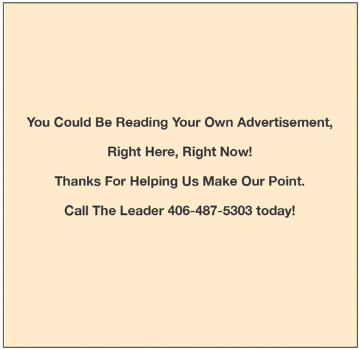 You Could Be Reading Your Own Advertisement, Right Here, Right Now! Thanks For Helping Us Make Our Point. Call The Leader 406-487-5303 today! You Could Be Reading Your Own Advertisement, Right Here, Right Now! Thanks For Helping Us Make Our Point. Call The Leader 406-487-5303 today!