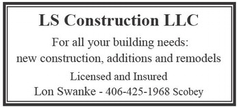 LS Construction LLC For all your building needs: new construction, additions and remodels Licensed and Insured Lon Swanke - 406-425-1968 Scobey LS Construction LLC For all your building needs: new construction, additions and remodels Licensed and Insured Lon Swanke - 406-425-1968 Scobey