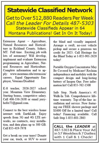 Statewide Classified Network Get to Over 512,880 Readers Per Week Call the Leader For Details 487-5303 Statewide Classifieds Appear in 64 Montana Publications! Get In On It Today! Extension Agent – Agriculture, Natural Resources and Horticulture in Richland County, Sidney, MT. Full time. Exciting job with lots of autonomy! Will develop, implement and evaluate Extension programming in Agriculture, Natural Resources and Horticulture. Complete information and to apply: www.montana.edu/extension/ careers. Equal Opportunity Employer, Veterans/Disabled K-8 teacher, 2026-2027 school year. Mountain View Elementary. Starting bonus, competitive salary. Call 406-336-2638 or email jerryhofer73@ the blind and visually impaired. Arrange a swift, no-cost vehicle pickup and secure a generous tax credit for 2025. Call Heritage for the Blind Today at 1-855-901-2620 today! Portable Oxygen Concentrator May Be Covered by Medicare! Reclaim independence and mobility with the compact design and long-lasting battery of Inogen One. Free information kit! Call 855-762-1508 Safe Step. North America’s #1 Walk-In Tub. Comprehensive lifetime warranty. Top-of-the-line installation and service. Now featuring our FREE shower package and $1600 Off for a limited time! Call today! Financing available. Call Safe Step 1-855-601-2865 gmail.com. Connect to the best wireless home internet with EarthLink. Enjoy speeds from 5G and 4G LTE networks, no contracts, easy installation, and data plans up to 300 GB. Call 855-419-7978 Get a break on your taxes! Donate your car, truck, or SUV to assist CALL the LEADER at 487-5303 & Place Your Ad in 57 Weeklies & 7 Dailies with 1 Call & 1 Check! Statewide Classified Network Get to Over 512,880 Readers Per Week Call the Leader For Details 487-5303 Statewide Classifieds Appear in 64 Montana Publications! Get In On It Today! Extension Agent – Agriculture, Natural Resources and Horticulture in Richland County, Sidney, MT. Full time. Exciting job with lots of autonomy! Will develop, implement and evaluate Extension programming in Agriculture, Natural Resources and Horticulture. Complete information and to apply: www.montana.edu/extension/ careers. Equal Opportunity Employer, Veterans/Disabled K-8 teacher, 2026-2027 school year. Mountain View Elementary. Starting bonus, competitive salary. Call 406-336-2638 or email jerryhofer73@ the blind and visually impaired. Arrange a swift, no-cost vehicle pickup and secure a generous tax credit for 2025. Call Heritage for the Blind Today at 1-855-901-2620 today! Portable Oxygen Concentrator May Be Covered by Medicare! Reclaim independence and mobility with the compact design and long-lasting battery of Inogen One. Free information kit! Call 855-762-1508 Safe Step. North America’s #1 Walk-In Tub. Comprehensive lifetime warranty. Top-of-the-line installation and service. Now featuring our FREE shower package and $1600 Off for a limited time! Call today! Financing available. Call Safe Step 1-855-601-2865 gmail.com. Connect to the best wireless home internet with EarthLink. Enjoy speeds from 5G and 4G LTE networks, no contracts, easy installation, and data plans up to 300 GB. Call 855-419-7978 Get a break on your taxes! Donate your car, truck, or SUV to assist CALL the LEADER at 487-5303 & Place Your Ad in 57 Weeklies & 7 Dailies with 1 Call & 1 Check!