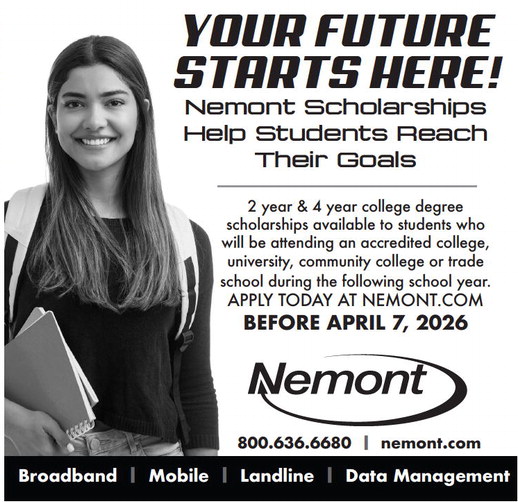YOUR FUTURE STARTS HERE! Nemont Scholarships Help Students Reach Their Goals 2 year & 4 year college degree scholarships available to students who will be attending an accredited college, university, community college or trade school during the following school year. APPLY TODAY AT NEMONT.COM BEFORE APRIL 7, 2026 800.636.6680 | nemont.com Broadband | Mobile | Landline | Data Management YOUR FUTURE STARTS HERE! Nemont Scholarships Help Students Reach Their Goals 2 year & 4 year college degree scholarships available to students who will be attending an accredited college, university, community college or trade school during the following school year. APPLY TODAY AT NEMONT.COM BEFORE APRIL 7, 2026 800.636.6680 | nemont.com Broadband | Mobile | Landline | Data Management