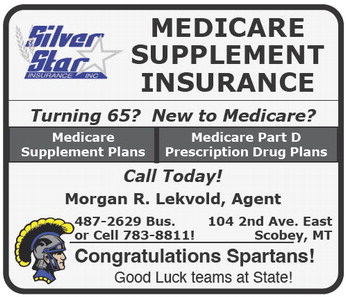 MEDICARE SUPPLEMENT INSURANCE Turning 65? New to Medicare? Medicare Supplement Plans Medicare Part D Prescription Drug Plans Call Today! Morgan R. Lekvold, Agent 487-2629 Bus. or Cell 783-8811! 104 2nd Ave. East Scobey, MT Congratulations Spartans! Good Luck teams at State! MEDICARE SUPPLEMENT INSURANCE Turning 65? New to Medicare? Medicare Supplement Plans Medicare Part D Prescription Drug Plans Call Today! Morgan R. Lekvold, Agent 487-2629 Bus. or Cell 783-8811! 104 2nd Ave. East Scobey, MT Congratulations Spartans! Good Luck teams at State!