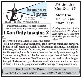 Fri - Sat - Sun RicharDson Mar 13-14-15 T heatre Owned and Operated for the community Show Times: Fri & Sat - 7 p.m. Sunday - 4 p.m. BEACON COMMUNITY FOUNDATION Dennis Quaid, Arielle Kebbel, Milo Ventimiglia, John Michael Finley, Sophie Skelton, Joshua Bassett I Can Only Imagine 2 Coming Attractions: I Can Only Imagine 2 (PG); Project Hail Mary (13); Hoppers (PG);TheSuperMarioGalaxy Movie (PG) PG 1 hr. 50 min. MercyMe’s Bart Millard is living the dream –sold-out arenas, a devoted fanbase, and a thriving career. But his world begins to shift under the weight of devastating challenges, including a life-changing diagnosis for his son, Sam. As Bart struggles to hold his family together, his wife Shannon becomes the steady anchor–caring for Sam, supporting Bart, and holding on to hope when it feels far away. When Sam and newcomer Tim Timmons join the band for their biggest tour yet, Bart must navigate the demands of fatherhood and the pressures of fame, all while helping his son find the courage to sing his own song. Tim Rask is the February winner of the Scobey Lions Club drawing - $25 worth of movie coupons. Fri - Sat - Sun RicharDson Mar 13-14-15 T heatre Owned and Operated for the community Show Times: Fri & Sat - 7 p.m. Sunday - 4 p.m. BEACON COMMUNITY FOUNDATION Dennis Quaid, Arielle Kebbel, Milo Ventimiglia, John Michael Finley, Sophie Skelton, Joshua Bassett I Can Only Imagine 2 Coming Attractions: I Can Only Imagine 2 (PG); Project Hail Mary (13); Hoppers (PG);TheSuperMarioGalaxy Movie (PG) PG 1 hr. 50 min. MercyMe’s Bart Millard is living the dream –sold-out arenas, a devoted fanbase, and a thriving career. But his world begins to shift under the weight of devastating challenges, including a life-changing diagnosis for his son, Sam. As Bart struggles to hold his family together, his wife Shannon becomes the steady anchor–caring for Sam, supporting Bart, and holding on to hope when it feels far away. When Sam and newcomer Tim Timmons join the band for their biggest tour yet, Bart must navigate the demands of fatherhood and the pressures of fame, all while helping his son find the courage to sing his own song. Tim Rask is the February winner of the Scobey Lions Club drawing - $25 worth of movie coupons.