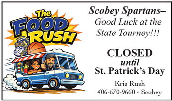 Scobey Spartans– Good Luck at the State Tourney!!! CLOSED until St. Patrick’s Day Kris Rush 406-670-9660 - Scobey Scobey Spartans– Good Luck at the State Tourney!!! CLOSED until St. Patrick’s Day Kris Rush 406-670-9660 - Scobey