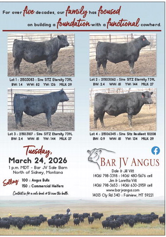 For over five decades, our family has focused on building a foundation with a functional cowherd. Lot 1 :: 21503083 :: Sire: SITZ Eternity 739L BW: 1.4 WW: 82 YW: 136 MILK: 29 Lot 2 :: 21503062 :: Sire: SITZ Eternity 739L BW: 2.4 WW: 81 YW: 144 MILK: 27 Lot 3 :: 21503107 :: Sire: SITZ Eternity 739L BW: 2.4 WW: 81 YW: 144 MILK: 27 Lot 4 :: 21506345 :: Sire: Sitz Resilient 10208 BW: 0.9 WW: 81 YW: 134 MILK: 29 Tuesday, March 24, 2026 1 p.m. MDT - Bar JV Sale Barn North of Sidney, Montana Sell ing: 100 :: Angus Bulls Dale & Jill Vitt (406) 798-3398 :: (406) 480-5676 cell Jim & Loretta Vitt (406) 798-3653 :: (406) 630-2959 cell www.barjvangus.com 150 :: Commercial Heifers Contact us for a sale book or to view the bulls. 14013 Cty Rd 340 :: Fairview, MT 59221 For over five decades, our family has focused on building a foundation with a functional cowherd. Lot 1 :: 21503083 :: Sire: SITZ Eternity 739L BW: 1.4 WW: 82 YW: 136 MILK: 29 Lot 2 :: 21503062 :: Sire: SITZ Eternity 739L BW: 2.4 WW: 81 YW: 144 MILK: 27 Lot 3 :: 21503107 :: Sire: SITZ Eternity 739L BW: 2.4 WW: 81 YW: 144 MILK: 27 Lot 4 :: 21506345 :: Sire: Sitz Resilient 10208 BW: 0.9 WW: 81 YW: 134 MILK: 29 Tuesday, March 24, 2026 1 p.m. MDT - Bar JV Sale Barn North of Sidney, Montana Sell ing: 100 :: Angus Bulls Dale & Jill Vitt (406) 798-3398 :: (406) 480-5676 cell Jim & Loretta Vitt (406) 798-3653 :: (406) 630-2959 cell www.barjvangus.com 150 :: Commercial Heifers Contact us for a sale book or to view the bulls. 14013 Cty Rd 340 :: Fairview, MT 59221