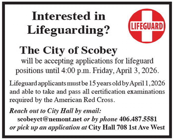Interested in Lifeguarding? The City of Scobey will be accepting applications for lifeguard positions until 4:00 p.m. Friday, April 3, 2026. Lifeguard applicants must be 15 years old byApril 1, 2026 and able to take and pass all certification examinations required by the American Red Cross. Reach out to City Hall by email: scobeyct@nemont.net or by phone 406.487.5581 or pick up an application at City Hall 708 1st Ave West Interested in Lifeguarding? The City of Scobey will be accepting applications for lifeguard positions until 4:00 p.m. Friday, April 3, 2026. Lifeguard applicants must be 15 years old byApril 1, 2026 and able to take and pass all certification examinations required by the American Red Cross. Reach out to City Hall by email: scobeyct@nemont.net or by phone 406.487.5581 or pick up an application at City Hall 708 1st Ave West