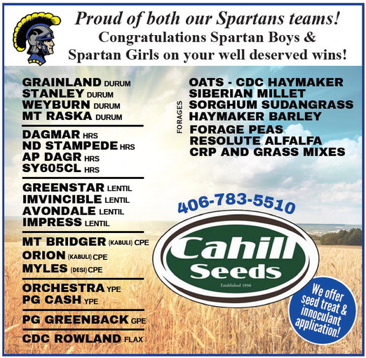 Proud of both our Spartans teams! Congratulations Spartan Boys & Spartan Girls on your well deserved wins! GRAINLAND DURUM STANLEY WEYBURN DURUM OATS - CDC HAYMAKER SIBERIAN MILLET SORGHUM SUDANGRASS HAYMAKER BARLEY DURUM MT RASKA DURUM FORAGES HRS FORAGE PEAS RESOLUTE ALFALFA CRP AND GRASS MIXES DAGMAR ND STAMPEDE AP DAGR SY605CL HRS HRS HRS LENTIL GREENSTAR IMVINCIBLE LENTIL 783- 5 510 LENTIL 406- AVONDALE IMPRESS LENTIL MT BRIDGER (KABULI) CPE ORION (KABULI) CPE MYLES (DESI) CPE ORCHESTRA PG CASH YPE YPE We offer seed treat & innoculant application! PG GREENBACK GPE CDC ROWLAND FLAX Proud of both our Spartans teams! Congratulations Spartan Boys & Spartan Girls on your well deserved wins! GRAINLAND DURUM STANLEY WEYBURN DURUM OATS - CDC HAYMAKER SIBERIAN MILLET SORGHUM SUDANGRASS HAYMAKER BARLEY DURUM MT RASKA DURUM FORAGES HRS FORAGE PEAS RESOLUTE ALFALFA CRP AND GRASS MIXES DAGMAR ND STAMPEDE AP DAGR SY605CL HRS HRS HRS LENTIL GREENSTAR IMVINCIBLE LENTIL 783- 5 510 LENTIL 406- AVONDALE IMPRESS LENTIL MT BRIDGER (KABULI) CPE ORION (KABULI) CPE MYLES (DESI) CPE ORCHESTRA PG CASH YPE YPE We offer seed treat & innoculant application! PG GREENBACK GPE CDC ROWLAND FLAX