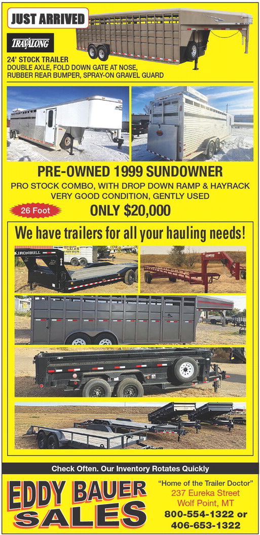 JUST ARRIVED 24’ STOCK TRAILER DOUBLE AXLE, FOLD DOWN GATE AT NOSE, RUBBER REAR BUMPER, SPRAY-ON GRAVEL GUARD PRE-OWNED 1999 SUNDOWNER PRO STOCK COMBO, WITH DROP DOWN RAMP & HAYRACK VERY GOOD CONDITION, GENTLY USED 26 Foot ONLY $20,000 We have trailers for all your hauling needs! Check Often. Our Inventory Rotates Quickly “Home of the Trailer Doctor” 237 Eureka Street Wolf Point, MT 800-554-1322 or 406-653-1322 JUST ARRIVED 24’ STOCK TRAILER DOUBLE AXLE, FOLD DOWN GATE AT NOSE, RUBBER REAR BUMPER, SPRAY-ON GRAVEL GUARD PRE-OWNED 1999 SUNDOWNER PRO STOCK COMBO, WITH DROP DOWN RAMP & HAYRACK VERY GOOD CONDITION, GENTLY USED 26 Foot ONLY $20,000 We have trailers for all your hauling needs! Check Often. Our Inventory Rotates Quickly “Home of the Trailer Doctor” 237 Eureka Street Wolf Point, MT 800-554-1322 or 406-653-1322