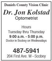 Daniels County Vision Clinic Dr. Jon Kolstad Optometrist Hours Tuesday thru Thursday 9:00 a.m. - 5:00 p.m. Doctor in Scobey on Wednesdays 487-5941 204 First Ave. W • Scobey Daniels County Vision Clinic Dr. Jon Kolstad Optometrist Hours Tuesday thru Thursday 9:00 a.m. - 5:00 p.m. Doctor in Scobey on Wednesdays 487-5941 204 First Ave. W • Scobey