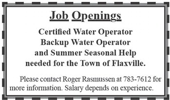 Job Openings Certified Water Operator Backup Water Operator and Summer Seasonal Help needed for the Town of Flaxville. Please contact Roger Rasmussen at 783-7612 for more information. Salary depends on experience. Job Openings Certified Water Operator Backup Water Operator and Summer Seasonal Help needed for the Town of Flaxville. Please contact Roger Rasmussen at 783-7612 for more information. Salary depends on experience.