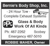 Bernie's Body Shop, Inc. - 24 Hour Tow Complete Exhaust Systems Glass & Body Work Of All Kinds Ph: 487-2262 Scobey Emergency 487-5010 ROBBIE MAHER, Owner