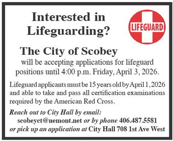 Interested in Lifeguarding? The City of Scobey will be accepting applications for lifeguard positions until 4:00 p.m. Friday, April 3, 2026. Lifeguard applicants must be 15 years old byApril 1, 2026 and able to take and pass all certification examinations required by the American Red Cross. Reach out to City Hall by email: scobeyct@nemont.net or by phone 406.487.5581 or pick up an application at City Hall 708 1st Ave West Interested in Lifeguarding? The City of Scobey will be accepting applications for lifeguard positions until 4:00 p.m. Friday, April 3, 2026. Lifeguard applicants must be 15 years old byApril 1, 2026 and able to take and pass all certification examinations required by the American Red Cross. Reach out to City Hall by email: scobeyct@nemont.net or by phone 406.487.5581 or pick up an application at City Hall 708 1st Ave West