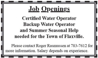 Job Openings Certified Water Operator Backup Water Operator and Summer Seasonal Help needed for the Town of Flaxville. Please contact Roger Rasmussen at 783-7612 for more information. Salary depends on experience. Job Openings Certified Water Operator Backup Water Operator and Summer Seasonal Help needed for the Town of Flaxville. Please contact Roger Rasmussen at 783-7612 for more information. Salary depends on experience.