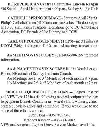 DC REPUBLICAN Central Committee Lincoln Reagan ‘26 Social – April 11th starting at 4:00 p.m., Scobey Saddle Club CATHOLICSPRINGRUMAGE– Saturday,April 25 at St. Philip’s Catholic Center (410Timmons) in Scobey.The doors open at 10:30 a.m., lunch available. Donations go to DC Ambulance Association, DC Friends of the Library, and CCW. TAKEOFFPOUNDSSENSIBLY(TOPS)– meet Fridays at KCGM. Weigh-ins begin at 11:30 a.m. and meeting starts at noon. AAMEETINGSINSCOBEY- Call 406-580-1567 for more information. AA & NA MEETINGS IN SCOBEY held in Youth League Room, NE corner of Scobey Lutheran Church. AA Meetings are 1st & 3rd Mondays of each month at 7 p.m. NA Meetings are 2nd & 4th Mondays of each month at 7 p.m. MEDICAL EQUIPMENT FOR LOAN — Legion Post 56 and VFW Post 173 has the following medical equipment for loan to people in Daniels County area - wheel chairs, walkers, canes, crutches, bath benches and commodes. If you would like to use some of these items contact: Fitch Hons – 406-783-7347 Brandon Kramer – 406-783-7882 VFW and American Legion Grave Service Markers available. DC REPUBLICAN Central Committee Lincoln Reagan ‘26 Social – April 11th starting at 4:00 p.m., Scobey Saddle Club CATHOLICSPRINGRUMAGE– Saturday,April 25 at St. Philip’s Catholic Center (410Timmons) in Scobey.The doors open at 10:30 a.m., lunch available. Donations go to DC Ambulance Association, DC Friends of the Library, and CCW. TAKEOFFPOUNDSSENSIBLY(TOPS)– meet Fridays at KCGM. Weigh-ins begin at 11:30 a.m. and meeting starts at noon. AAMEETINGSINSCOBEY- Call 406-580-1567 for more information. AA & NA MEETINGS IN SCOBEY held in Youth League Room, NE corner of Scobey Lutheran Church. AA Meetings are 1st & 3rd Mondays of each month at 7 p.m. NA Meetings are 2nd & 4th Mondays of each month at 7 p.m. MEDICAL EQUIPMENT FOR LOAN — Legion Post 56 and VFW Post 173 has the following medical equipment for loan to people in Daniels County area - wheel chairs, walkers, canes, crutches, bath benches and commodes. If you would like to use some of these items contact: Fitch Hons – 406-783-7347 Brandon Kramer – 406-783-7882 VFW and American Legion Grave Service Markers available.