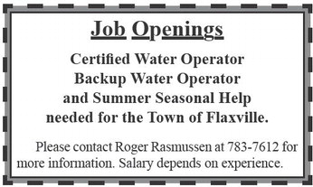 Job Openings Certified Water Operator Backup Water Operator and Summer Seasonal Help needed for the Town of Flaxville. Please contact Roger Rasmussen at 783-7612 for more information. Salary depends on experience. Job Openings Certified Water Operator Backup Water Operator and Summer Seasonal Help needed for the Town of Flaxville. Please contact Roger Rasmussen at 783-7612 for more information. Salary depends on experience.