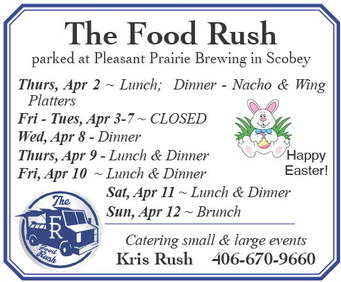 News Posted on April 1, 2026 Posted on April 1, 2026 The Food Rush parked at Pleasant Prairie Brewing in Scobey Thurs, Apr 2 ~ Lunch; Dinner - Nacho & Wing Platters Fri - Tues, Apr 3-7 ~ CLOSED Wed, Apr 8 - Dinner Thurs, Apr 9 - Lunch & Dinner Fri, Apr 10 ~ Lunch & Dinner Sat, Apr 11 ~ Lunch & Dinner Sun, Apr 12 ~ Brunch Happy Easter! Catering small & large events Kris Rush 406-670-9660 The Food Rush parked at Pleasant Prairie Brewing in Scobey Thurs, Apr 2 ~ Lunch; Dinner - Nacho & Wing Platters Fri - Tues, Apr 3-7 ~ CLOSED Wed, Apr 8 - Dinner Thurs, Apr 9 - Lunch & Dinner Fri, Apr 10 ~ Lunch & Dinner Sat, Apr 11 ~ Lunch & Dinner Sun, Apr 12 ~ Brunch Happy Easter! Catering small & large events Kris Rush 406-670-9660