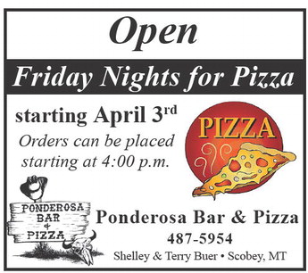 Open Friday Nights for Pizza starting April 3 rd Orders can be placed starting at 4:00 p.m. Ponderosa Bar & Pizza 487-5954 Shelley & Terry Buer • Scobey, MT Open Friday Nights for Pizza starting April 3 rd Orders can be placed starting at 4:00 p.m. Ponderosa Bar & Pizza 487-5954 Shelley & Terry Buer • Scobey, MT
