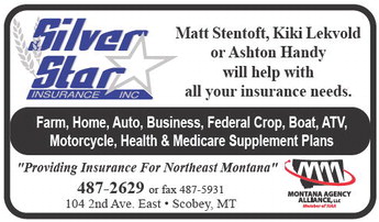 Matt Stentoft, Kiki Lekvold or Ashton Handy will help with all your insurance needs. Farm, Home, Auto, Business, Federal Crop, Boat, ATV, Motorcycle, Health & Medicare Supplement Plans 'Providing Insurance For Northeast Montana' 487-2629 or fax 487-5931 104 2nd Ave. East • Scobey, MT Matt Stentoft, Kiki Lekvold or Ashton Handy will help with all your insurance needs. Farm, Home, Auto, Business, Federal Crop, Boat, ATV, Motorcycle, Health & Medicare Supplement Plans 'Providing Insurance For Northeast Montana' 487-2629 or fax 487-5931 104 2nd Ave. East • Scobey, MT