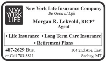New York Life Insurance Company Be Good at Life Morgan R. Lekvold, RICP Agent • Life Insurance • Long Term Care Insurance • Retirement Plans 487-2629 Bus. 104 2nd Ave. East or Cell 783-8811 Scobey, MT New York Life Insurance Company Be Good at Life Morgan R. Lekvold, RICP Agent • Life Insurance • Long Term Care Insurance • Retirement Plans 487-2629 Bus. 104 2nd Ave. East or Cell 783-8811 Scobey, MT