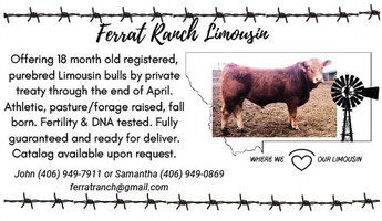 Ferrat Ranch Limousin Offering 18 month old registered, purebred Limousin bulls by private treaty through the end of April. Athletic, pasture/forage raised, fall born. Fertility & DNA tested. Fully guaranteed and ready for deliver. Catalog available upon request. Where we our Limousin John (406) 949-7911 or Samantha (406) 949-0869 ferratranch@gmail.com Ferrat Ranch Limousin Offering 18 month old registered, purebred Limousin bulls by private treaty through the end of April. Athletic, pasture/forage raised, fall born. Fertility & DNA tested. Fully guaranteed and ready for deliver. Catalog available upon request. Where we our Limousin John (406) 949-7911 or Samantha (406) 949-0869 ferratranch@gmail.com