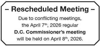 – Rescheduled Meeting – Due to conflicting meetings, the April 7th, 2026 regular D.C. Commissioner’s meeting will be held on April 8th, 2026. – Rescheduled Meeting – Due to conflicting meetings, the April 7th, 2026 regular D.C. Commissioner’s meeting will be held on April 8th, 2026.